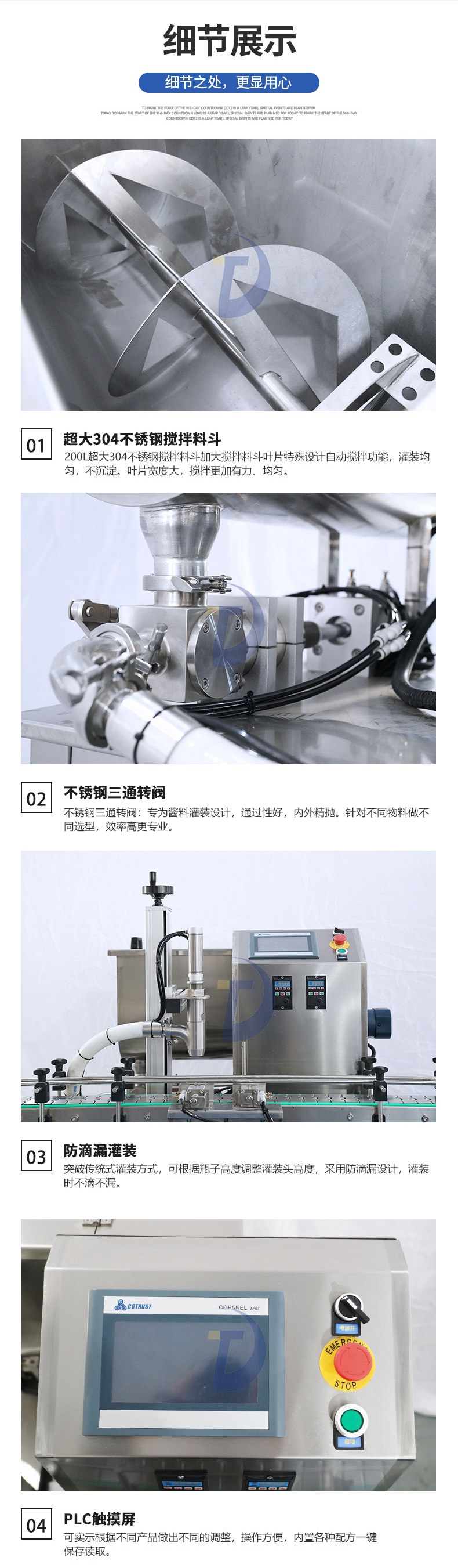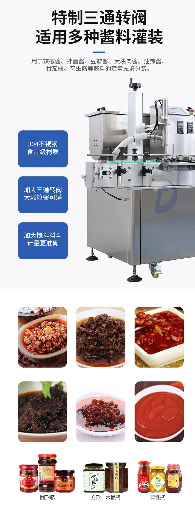 小型醬料灌裝生產(chǎn)線 包括半自動將料灌裝機 半自動真空旋蓋機以及半自動貼標機 適用于初期辦廠研發(fā)設計。灌裝機用于垃圾愛哦將、拌面醬、豆瓣醬、大塊肉醬等物料的定量灌裝,變頻攪拌讓物料均勻,200L的大料斗讓物料充足。南自動真空旋蓋機單人便可以操作,支持多種瓶型抽真空旋蓋,適用于塑料、金屬材質的圓蓋。