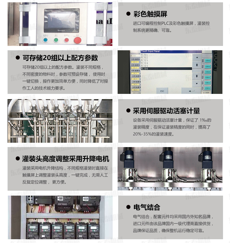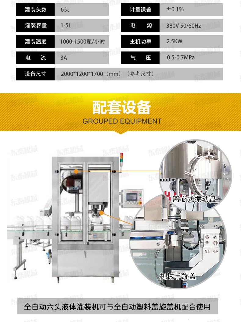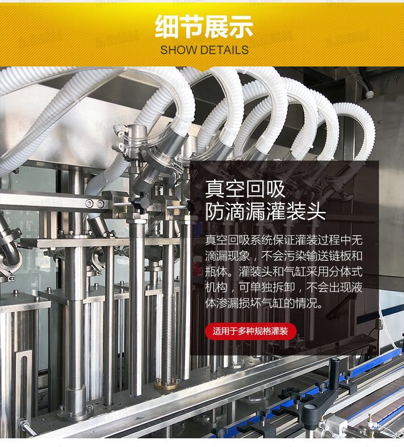 5、具有無瓶不灌裝、自動進瓶出瓶、自動定位灌裝、自動控制液位等功能,自動化程度高;灌裝嘴設計科學合理,配防滴漏裝置,灌裝不滴漏,擁有物料瓶及設備的干凈衛(wèi)生。