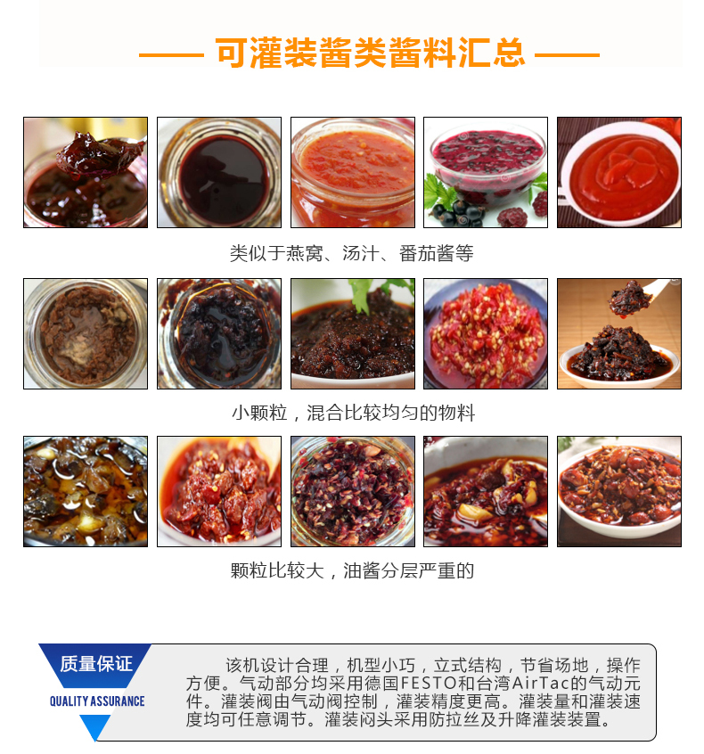 身為公司新生產(chǎn)制造的灌裝機(jī)在行業(yè)市場上發(fā)揮了重要的作用,是集光,機(jī),電,氣于一體,選用活塞式定量原理,灌裝精確度高,使用比較簡單,維護(hù)非常方便,設(shè)備主要材質(zhì):辣椒醬灌裝機(jī)選用SUS304不銹鋼制造,衛(wèi)生指標(biāo)要求.灌裝環(huán)節(jié)選用亞克力透明板與外部隔離,確保灌裝的衛(wèi)生要求。灌裝選用壓力式灌裝,無須配裝高位罐,簡易化了組裝工序,提高了灌裝工作效率??善毡槭褂糜谑称贰⑨u料制造業(yè)設(shè)備的自動化包裝生產(chǎn)制造